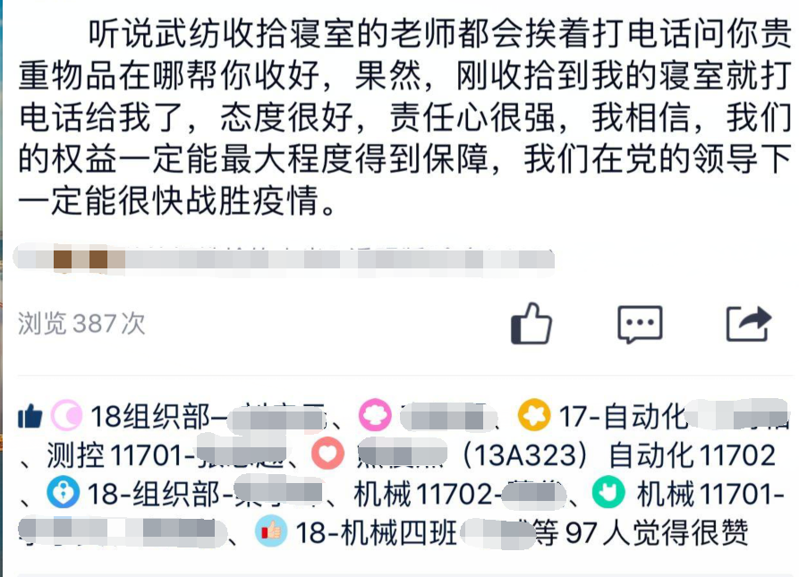 这次储备隔离点涉及到澳门十大老牌信誉平台排行榜员工所在一个楼栋,带班辅导员孙毅虽然身在老家,不能赶赴武汉参加抗疫,但他迅速在班级群统计员工在校贵重物品清单,一边与清理的老师现场联系,一边做好员工工作,得到同学们支持与点赞。