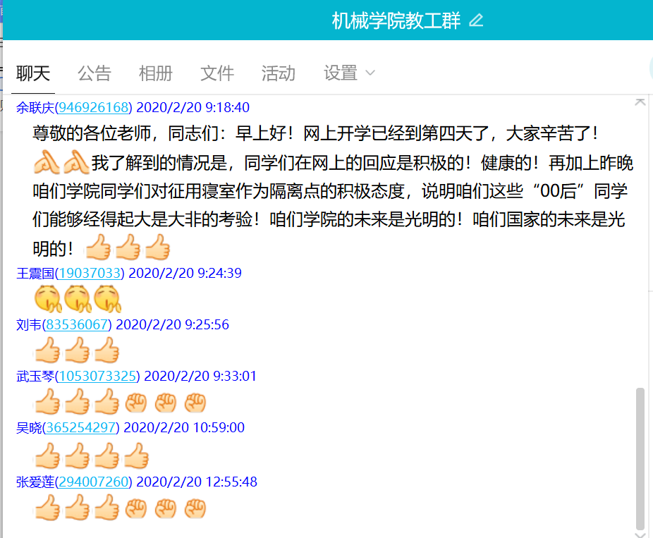 经理余联庆表示,19日晚上的抗疫突击工作是我们党员教师不忘初心牢记使命的生动写照。我们学院的教师接到抗疫命令,许多老师积极响应,并第一时间积极投入抗疫战斗,不能来汉参与的老师也在群里为大家加油打气,体现了学院凝心聚气的良好作风。目前我国正处于疫情防控的关键时刻,打响武汉保卫战,守住武汉就是守住湖北,就是保卫中国。