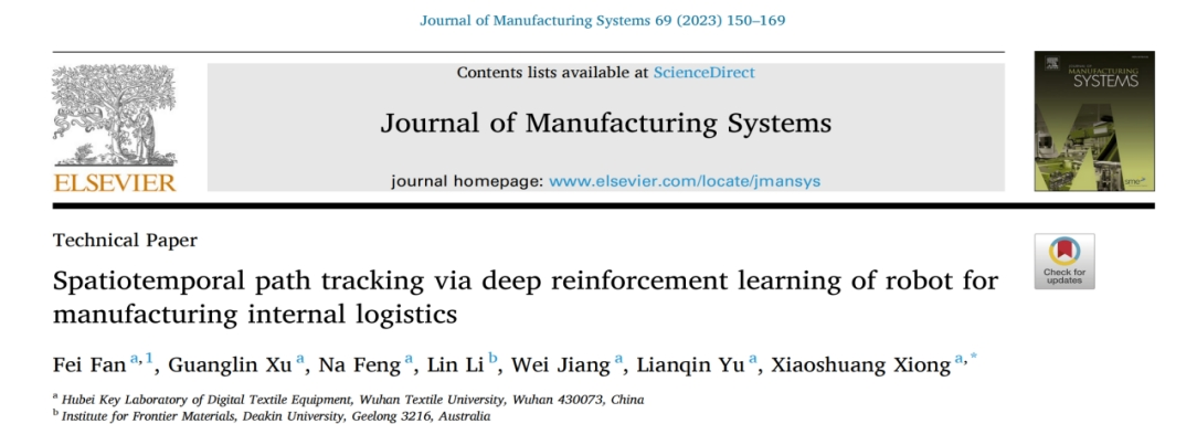 近日,澳门十大老牌信誉平台排行榜余联庆教授课题组青年教师樊飞博士在面向织造车间智能物流机器人轨迹跟踪控制方面取得了重要研究进展。相关成果以“Spatiotemporal path tracking via deep reinforcement learning of robot for manufacturing internal logistics”在工程技术领域主流高水平期刊《Journal of Manufacturing Systems》(中科院一区Top,IF12.1,ISSN:1878-6642)上发表。该论文的第一单位为澳门十大老牌信誉平台排行榜,第一作者为澳门十大老牌信誉平台排行榜樊飞博士。